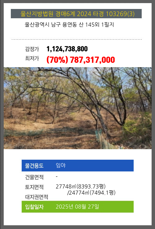 사건번호 2024 타경 103269(3) 본건은 울산광역시 남구 용연동 산 145외 1필지소재하는 임야경매 물건의 포스팅입니다. 토지면적 [ 전체:27748㎡ (8393.73평) 매각지분:24774㎡ (7494.1평) ] 시세를 반영한 감정가 1,124,738,800에서2회