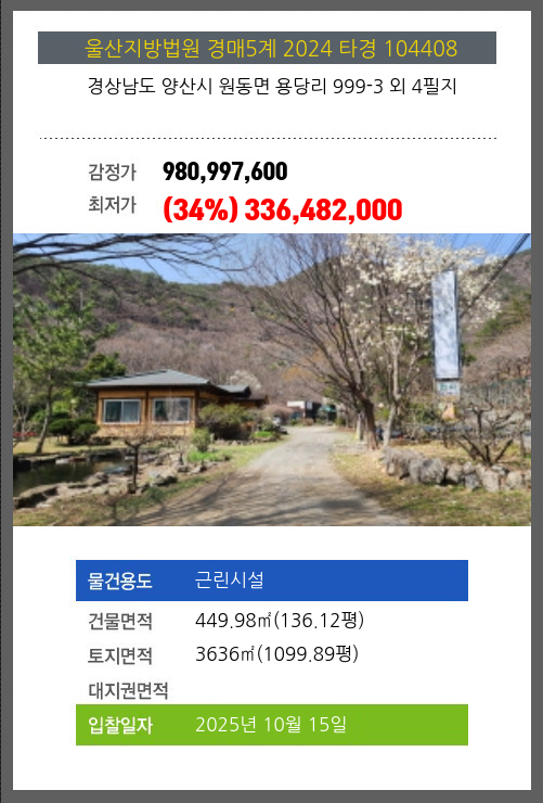 사건번호 2024 타경 104408 본건은 경상남도 양산시 원동면 용당리 999-3 외 4필지소재하는 근린시설경매 물건의 포스팅입니다. 건물면적 [ 449.98㎡ (136.12평) ]토지면적 [ 3636㎡ (1099.89평) ] 시세를