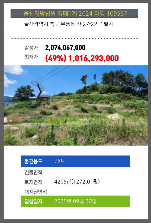 사건번호 2024 타경 109557 본건은 울산광역시 북구 무룡동 산 27-2외 1필지소재하는 임야경매 물건의 포스팅입니다. 토지면적 [ 4205㎡ (1272.01평) ] 시세를 반영한 감정가 2,074,067,000에서2회 유찰되어 감정가