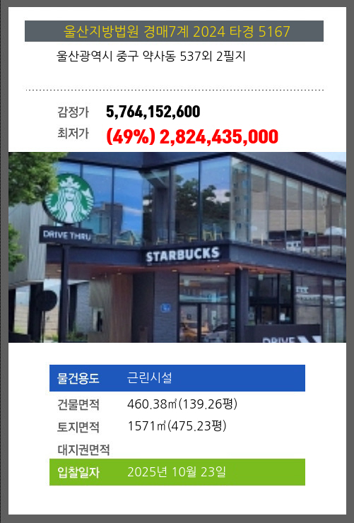 사건번호 2024 타경 5167 본건은 울산광역시 중구 약사동 537외 2필지소재하는 근린시설경매 물건의 포스팅입니다. 건물면적 [ 460.38㎡ (139.26평) ]토지면적 [ 1571㎡ (475.23평) ] 시세를 반영한 감정가