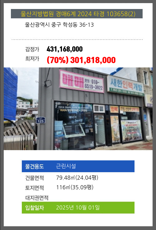 사건번호 2024 타경 103658(2) 본건은 울산광역시 중구 학성동 36-13소재하는 근린시설경매 물건의 포스팅입니다. 건물면적 [ 79.48㎡ (24.04평) ]토지면적 [ 116㎡ (35.09평) ] 시세를 반영한 감정가 431,168,000에서1회