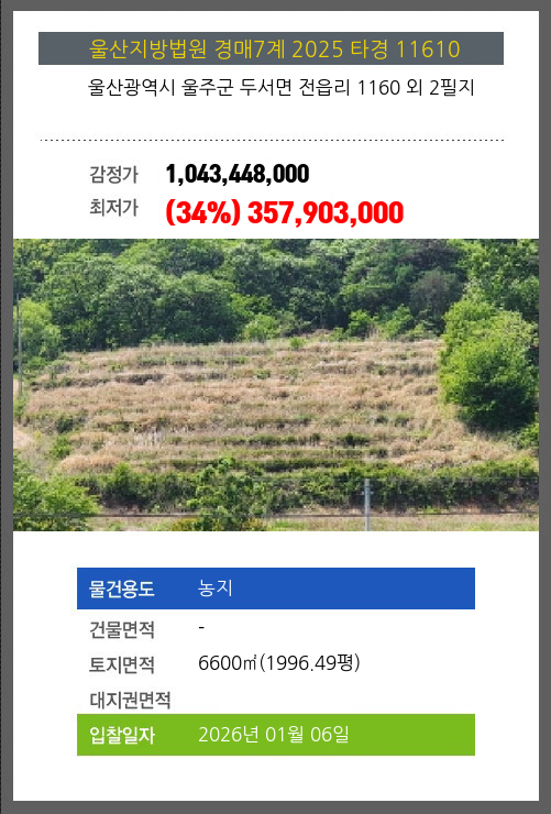 사건번호 2025 타경 11610 본건은 울산광역시 울주군 두서면 전읍리 1160 외 2필지소재하는 농지경매 물건의 포스팅입니다. 토지면적 [ 6600㎡ (1996.49평) ] 시세를 반영한 감정가 1,043,448,000에서3회 유찰되어