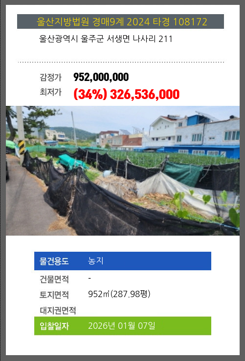 사건번호 2024 타경 108172 본건은 울산광역시 울주군 서생면 나사리 211소재하는 농지경매 물건의 포스팅입니다. 토지면적 [ 952㎡ (287.98평) ] 시세를 반영한 감정가 952,000,000에서3회 유찰되어 감정가 대비