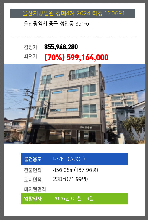 사건번호 2024 타경 120691 본건은 울산광역시 중구 성안동 861-6소재하는 다가구(원룸등)경매 물건의 포스팅입니다. 건물면적 [ 456.06㎡ (137.96평) ]토지면적 [ 238㎡ (71.99평) ] 시세를 반영한 감정가 855,948,280에서1회