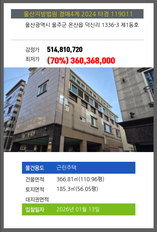 사건번호 2024 타경 119011 본건은 울산광역시 울주군 온산읍 덕신리 1336-3 제1동호소재하는 근린주택경매 물건의 포스팅입니다. 건물면적 [ 366.81㎡ (110.96평) ]토지면적 [ 185.3㎡ (56.05평) ] 시세를 반영한