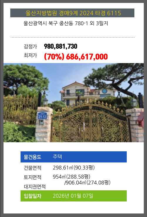 사건번호 2024 타경 6115 본건은 울산광역시 북구 중산동 780-1 외 3필지소재하는 주택경매 물건의 포스팅입니다. 건물면적 [ 298.61㎡ (90.33평) ]토지면적 [ 전체:954㎡ (288.58평) 매각지분:906.04㎡ (274.08평) ]