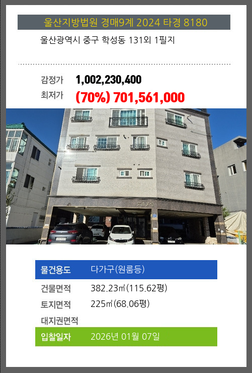 사건번호 2024 타경 8180 본건은 울산광역시 중구 학성동 131외 1필지소재하는 다가구(원룸등)경매 물건의 포스팅입니다. 건물면적 [ 382.23㎡ (115.62평) ]토지면적 [ 225㎡ (68.06평) ] 시세를 반영한 감정가