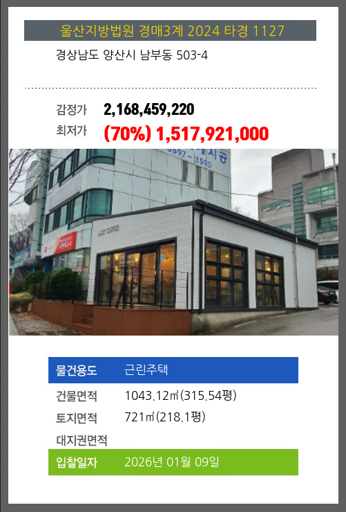사건번호 2024 타경 1127 본건은 경상남도 양산시 남부동 503-4소재하는 근린주택경매 물건의 포스팅입니다. 건물면적 [ 1043.12㎡ (315.54평) ]토지면적 [ 721㎡ (218.1평) ] 시세를 반영한 감정가 2,168,459,220에서1회