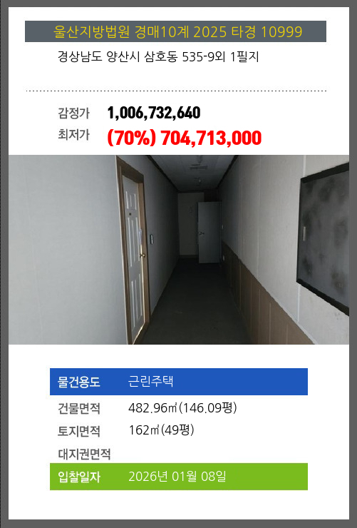 사건번호 2025 타경 10999 본건은 경상남도 양산시 삼호동 535-9외 1필지소재하는 근린주택경매 물건의 포스팅입니다. 건물면적 [ 482.96㎡ (146.09평) ]토지면적 [ 162㎡ (49평) ] 시세를 반영한 감정가