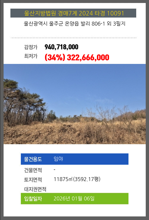 사건번호 2024 타경 10091 본건은 울산광역시 울주군 온양읍 발리 806-1 외 3필지소재하는 임야경매 물건의 포스팅입니다. 토지면적 [ 11875㎡ (3592.17평) ] 시세를 반영한 감정가 940,718,000에서3회 유찰되어