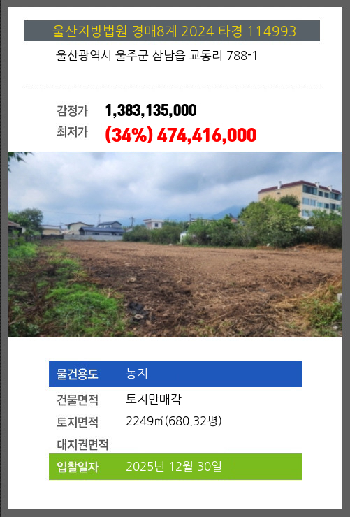 사건번호 2024 타경 114993 본건은 울산광역시 울주군 삼남읍 교동리 788-1소재하는 농지경매 물건의 포스팅입니다. 건물면적 [ 토지만매각 ]토지면적 [ 2249㎡ (680.32평) ] 시세를 반영한 감정가 1,383,135,000에서3회