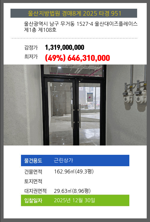 사건번호 2025 타경 951 본건은 울산광역시 남구 무거동 1527-4 울산대이즈플레이스 제1층 제108호소재하는 근린상가경매 물건의 포스팅입니다. 건물면적 [ 162.96㎡ (49.3평) ]대지권 [ 29.63㎡ (8.96평) ] 시세를