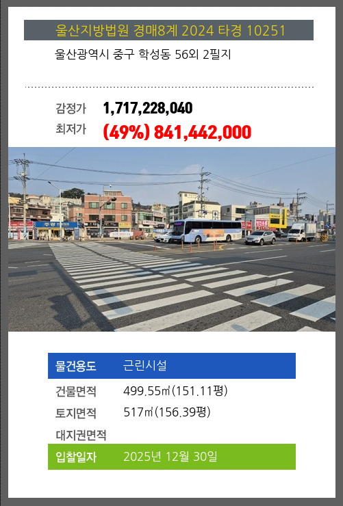 사건번호 2024 타경 10251 본건은 울산광역시 중구 학성동 56외 2필지소재하는 근린시설경매 물건의 포스팅입니다. 건물면적 [ 499.55㎡ (151.11평) ]토지면적 [ 517㎡ (156.39평) ] 시세를 반영한 감정가