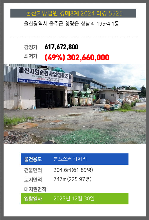 사건번호 2024 타경 5525 본건은 울산광역시 울주군 청량읍 상남리 195-4 1동소재하는 분뇨쓰레기처리경매 물건의 포스팅입니다. 건물면적 [ 204.6㎡ (61.89평) ]토지면적 [ 747㎡ (225.97평) ] 시세를 반영한