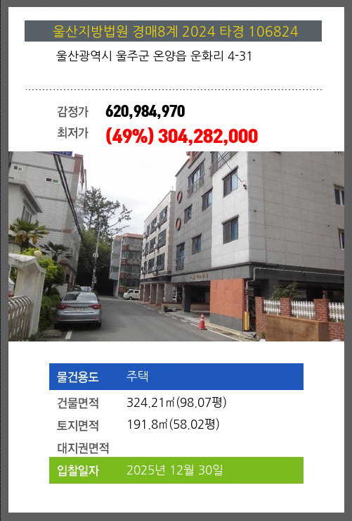 사건번호 2024 타경 106824 본건은 울산광역시 울주군 온양읍 운화리 4-31소재하는 주택경매 물건의 포스팅입니다. 건물면적 [ 324.21㎡ (98.07평) ]토지면적 [ 191.8㎡ (58.02평) ] 시세를 반영한 감정가