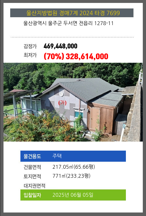 사건번호 2024 타경 7699 본건은 울산광역시 울주군 두서면 전읍리 1278-11소재하는 주택경매 물건의 포스팅입니다. 건물면적 [ 217.05㎡ (65.66평) ]토지면적 [ 771㎡ (233.23평) ] 시세를 반영한 감정가