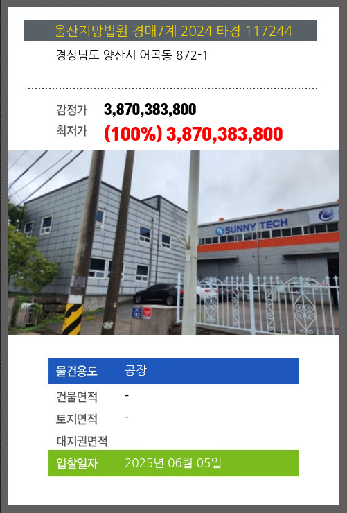 사건번호 2024 타경 117244 본건은 경상남도 양산시 어곡동 872-1소재하는 공장경매 물건의 포스팅입니다. 시세를 반영한 감정가 3,870,383,800에서신건으로 감정가 대비 100%최저가 3,870,383,800부터입찰에 참여할 수 있습니다. 입찰보증금은 최저가