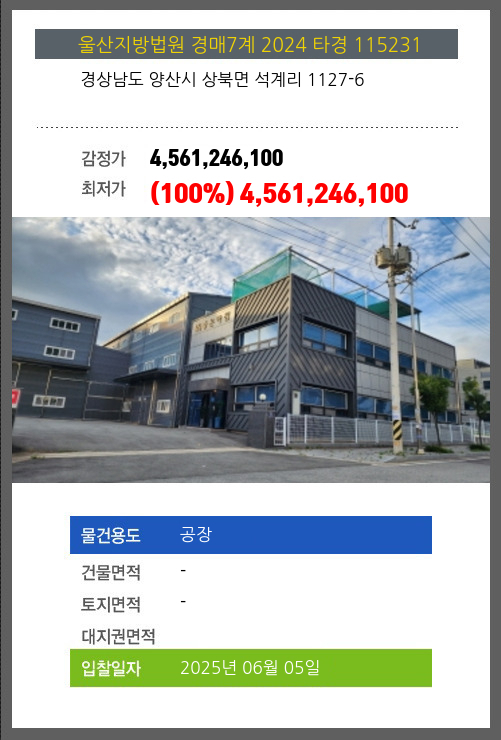 사건번호 2024 타경 115231 본건은 경상남도 양산시 상북면 석계리 1127-6소재하는 공장경매 물건의 포스팅입니다. 시세를 반영한 감정가 4,561,246,100에서신건으로 감정가 대비 100%최저가 4,561,246,100부터입찰에 참여할 수 있습니다. 입찰보증금은
