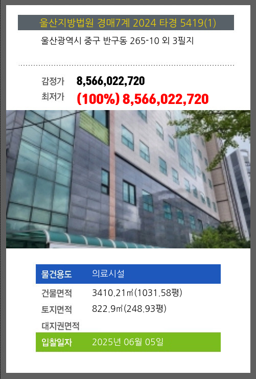 사건번호 2024 타경 5419(1) 본건은 울산광역시 중구 반구동 265-10 외 3필지소재하는 의료시설경매 물건의 포스팅입니다. 건물면적 [ 3410.21㎡ (1031.58평) ]토지면적 [ 822.9㎡ (248.93평) ] 시세를 반영한