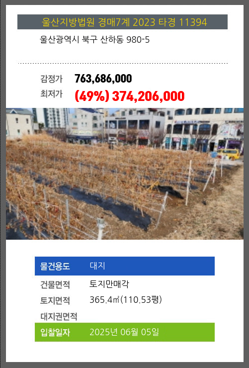 사건번호 2023 타경 11394 본건은 울산광역시 북구 산하동 980-5소재하는 대지경매 물건의 포스팅입니다. 건물면적 [ 토지만매각 ]토지면적 [ 365.4㎡ (110.53평) ] 시세를 반영한 감정가 763,686,000에서2회 유찰되어