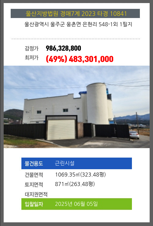 사건번호 2023 타경 10841 본건은 울산광역시 울주군 웅촌면 은현리 548-1외 1필지소재하는 근린시설경매 물건의 포스팅입니다. 건물면적 [ 1069.35㎡ (323.48평) ]토지면적 [ 871㎡ (263.48평) ] 시세를 반영한