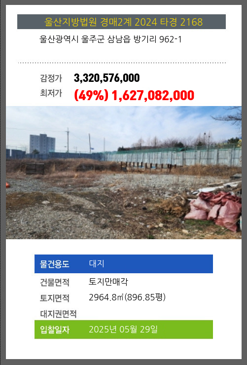 사건번호 2024 타경 2168 본건은 울산광역시 울주군 삼남읍 방기리 962-1소재하는 대지경매 물건의 포스팅입니다. 건물면적 [ 토지만매각 ]토지면적 [ 2964.8㎡ (896.85평) ] 시세를 반영한 감정가 3,320,576,000에서2회