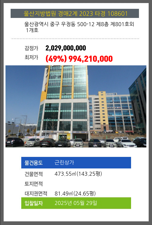 사건번호 2023 타경 108601 본건은 울산광역시 중구 우정동 500-12 제8층 제801호외 1개호소재하는 근린상가경매 물건의 포스팅입니다. 건물면적 [ 473.55㎡ (143.25평) ]대지권 [ 81.49㎡ (24.65평) ] 시세를