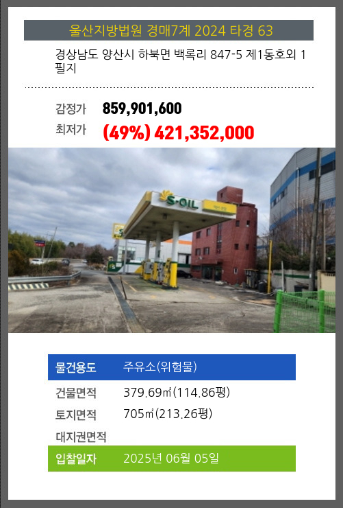 사건번호 2024 타경 63 본건은 경상남도 양산시 하북면 백록리 847-5 제1동호외 1필지소재하는 주유소(위험물)경매 물건의 포스팅입니다. 건물면적 [ 379.69㎡ (114.86평) ]토지면적 [ 705㎡ (213.26평) ] 시세를