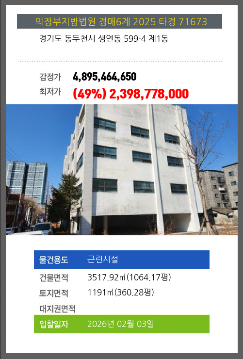 사건번호 2025 타경 71673 본건은 경기도 동두천시 생연동 599-4 제1동소재하는 근린시설경매 물건의 포스팅입니다. 건물면적 [ 3517.92㎡ (1064.17평) ]토지면적 [ 1191㎡ (360.28평) ] 시세를 반영한 감정가
