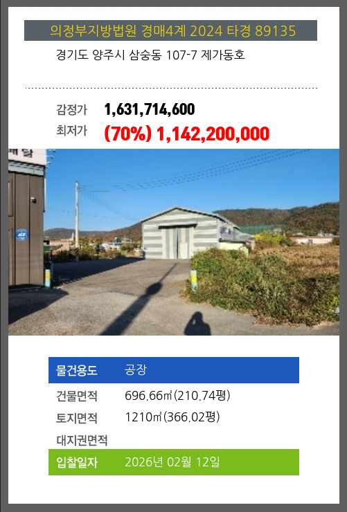 사건번호 2024 타경 89135 본건은 경기도 양주시 삼숭동 107-7 제가동호소재하는 공장경매 물건의 포스팅입니다. 건물면적 [ 696.66㎡ (210.74평) ]토지면적 [ 1210㎡ (366.02평) ] 시세를 반영한 감정가