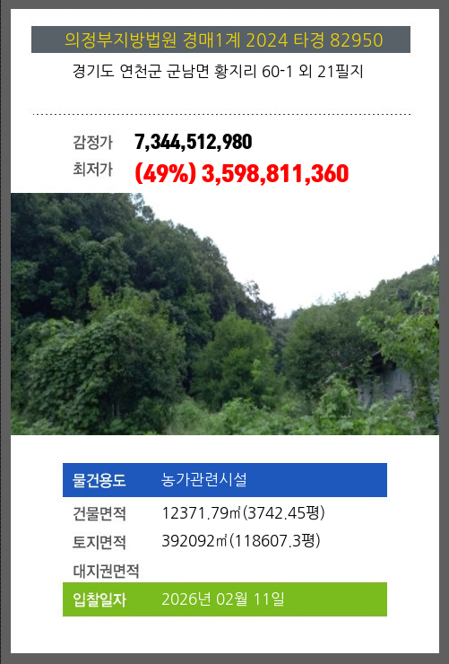 사건번호 2024 타경 82950 본건은 경기도 연천군 군남면 황지리 60-1 외 21필지소재하는 농가관련시설경매 물건의 포스팅입니다. 건물면적 [ 12371.79㎡ (3742.45평) ]토지면적 [ 392092㎡ (118607.3평) ] 시세를
