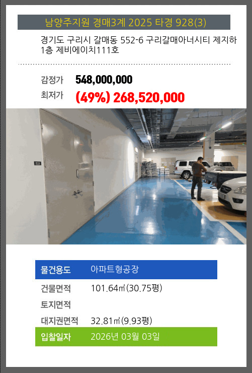 사건번호 2025 타경 928(3) 본건은 경기도 구리시 갈매동 552-6 구리갈매아너시티 제지하1층 제비에이치111호소재하는 아파트형공장경매 물건의 포스팅입니다. 건물면적 [ 101.64㎡ (30.75평) ]대지권 [ 32.81㎡ (9.93평) ] 시세를