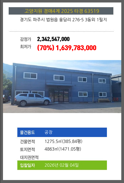 사건번호 2025 타경 63519 본건은 경기도 파주시 법원읍 웅담리 276-5 3동외 1필지소재하는 공장경매 물건의 포스팅입니다. 건물면적 [ 1275.5㎡ (385.84평) ]토지면적 [ 4863㎡ (1471.05평) ] 시세를