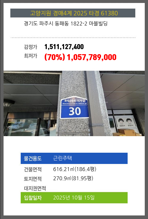 사건번호 2025 타경 61380 본건은 경기도 파주시 동패동 1822-2 마블빌딩소재하는 근린주택경매 물건의 포스팅입니다. 건물면적 [ 616.21㎡ (186.4평) ]토지면적 [ 270.9㎡ (81.95평) ] 시세를 반영한 감정가