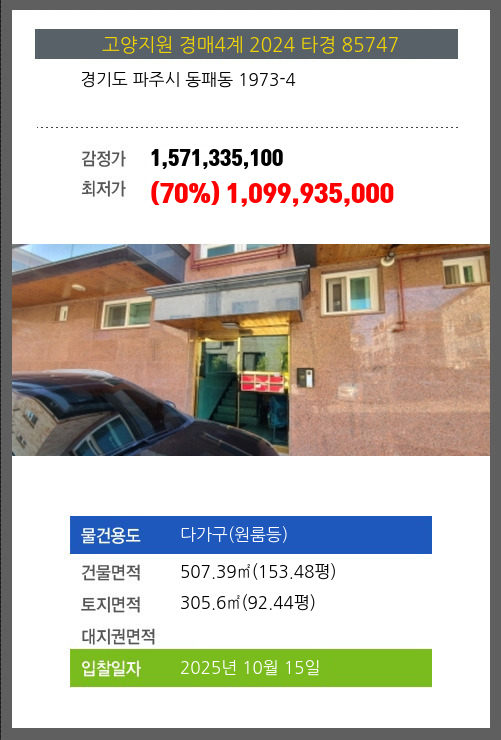 사건번호 2024 타경 85747 본건은 경기도 파주시 동패동 1973-4소재하는 다가구(원룸등)경매 물건의 포스팅입니다. 건물면적 [ 507.39㎡ (153.48평) ]토지면적 [ 305.6㎡ (92.44평) ] 시세를 반영한 감정가 1,571,335,100에서1회