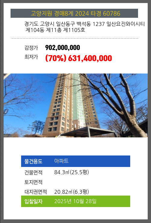 사건번호 2024 타경 60786 본건은 경기도 고양시 일산동구 백석동 1237 일산요진와이시티 제104동 제11층 제1105호소재하는 아파트경매 물건의 포스팅입니다. 건물면적 [ 84.3㎡ (25.5평) ]대지권 [ 20.82㎡ (6.3평)