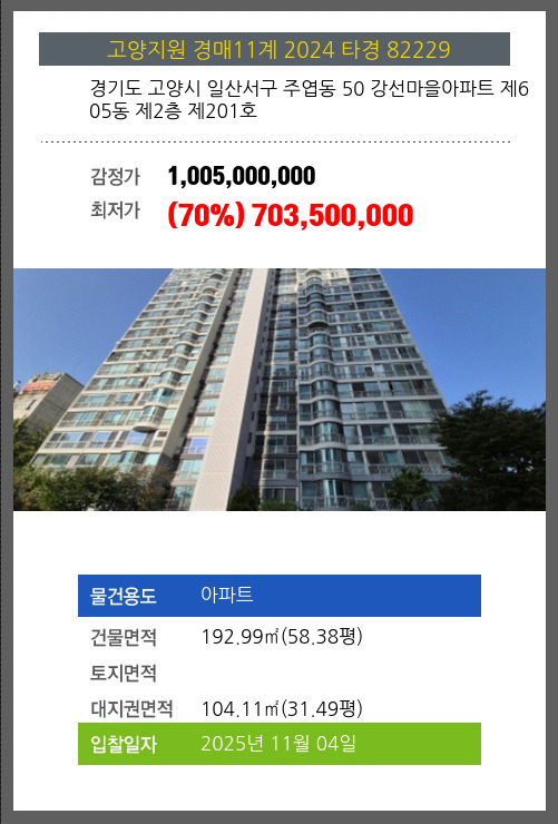사건번호 2024 타경 82229 본건은 경기도 고양시 일산서구 주엽동 50 강선마을아파트 제605동 제2층 제201호소재하는 아파트경매 물건의 포스팅입니다. 건물면적 [ 192.99㎡ (58.38평) ]대지권 [ 104.11㎡ (31.49평)