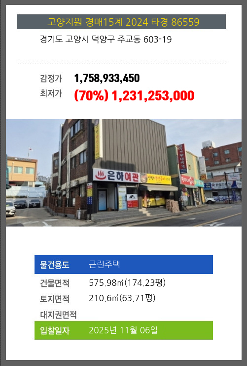 사건번호 2024 타경 86559 본건은 경기도 고양시 덕양구 주교동 603-19소재하는 근린주택경매 물건의 포스팅입니다. 건물면적 [ 575.98㎡ (174.23평) ]토지면적 [ 210.6㎡ (63.71평) ] 시세를 반영한 감정가
