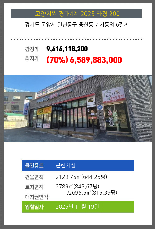 사건번호 2025 타경 200 본건은 경기도 고양시 일산동구 중산동 7 가동외 6필지소재하는 근린시설경매 물건의 포스팅입니다. 건물면적 [ 2129.75㎡ (644.25평) ]토지면적 [ 전체:2789㎡ (843.67평) 매각지분:2695.5㎡ (815.39평)