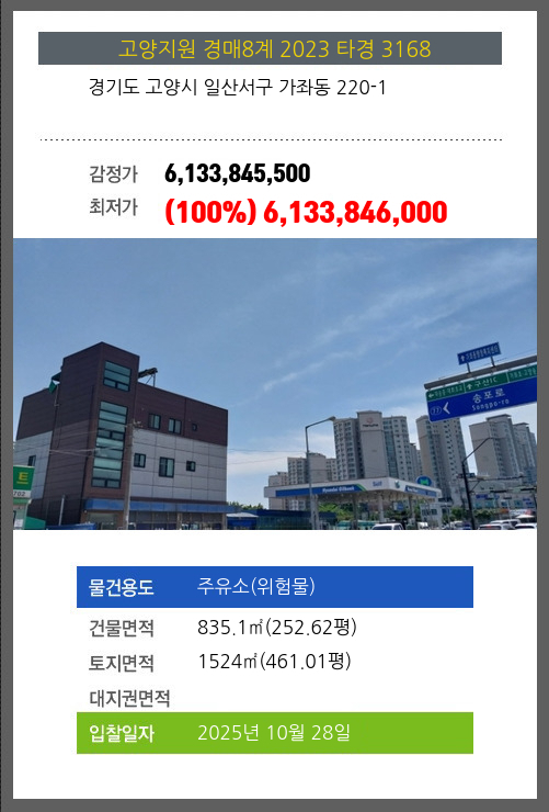 사건번호 2023 타경 3168 본건은 경기도 고양시 일산서구 가좌동 220-1소재하는 주유소(위험물)경매 물건의 포스팅입니다. 건물면적 [ 835.1㎡ (252.62평) ]토지면적 [ 1524㎡ (461.01평) ] 시세를 반영한 감정가