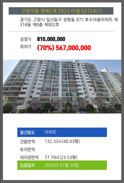 사건번호 2025 타경 62724(1) 본건은 경기도 고양시 일산동구 장항동 877 호수마을아파트 제316동 제8층 제802호소재하는 아파트경매 물건의 포스팅입니다. 건물면적 [ 132.33㎡ (40.03평) ]대지권 [ 77.79㎡ (23.53평)