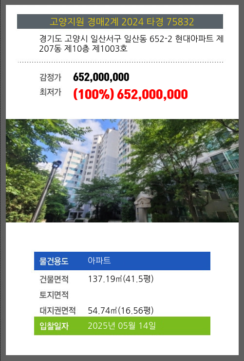 사건번호 2024 타경 75832 본건은 경기도 고양시 일산서구 일산동 652-2 현대아파트 제207동 제10층 제1003호소재하는 아파트경매 물건의 포스팅입니다. 건물면적 [ 137.19㎡ (41.5평) ]대지권 [ 54.74㎡ (16.56평)