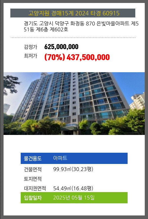 사건번호 2024 타경 60915 본건은 경기도 고양시 덕양구 화정동 870 은빛마을아파트 제551동 제6층 제602호소재하는 아파트경매 물건의 포스팅입니다. 건물면적 [ 99.93㎡ (30.23평) ]대지권 [ 54.49㎡ (16.48평)