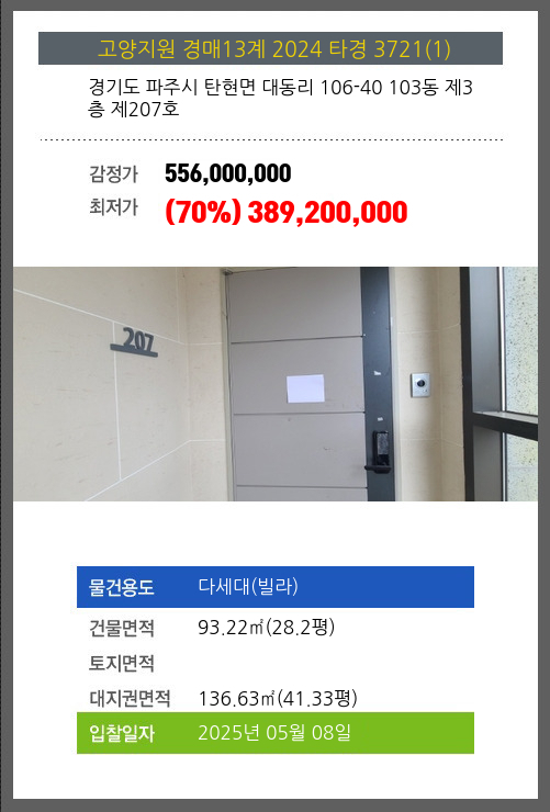 사건번호 2024 타경 3721(1) 본건은 경기도 파주시 탄현면 대동리 106-40 103동 제3층 제207호소재하는 다세대(빌라)경매 물건의 포스팅입니다. 건물면적 [ 93.22㎡ (28.2평) ]대지권 [ 136.63㎡ (41.33평) ]