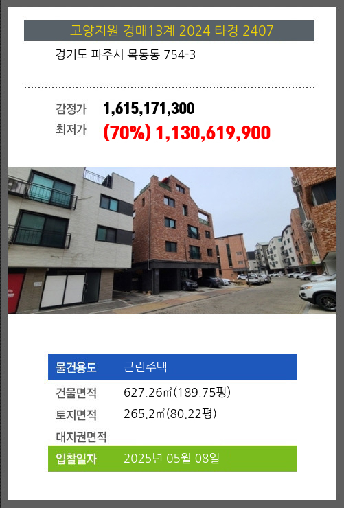 사건번호 2024 타경 2407 본건은 경기도 파주시 목동동 754-3소재하는 근린주택경매 물건의 포스팅입니다. 건물면적 [ 627.26㎡ (189.75평) ]토지면적 [ 265.2㎡ (80.22평) ] 시세를 반영한 감정가 1,615,171,300에서1회