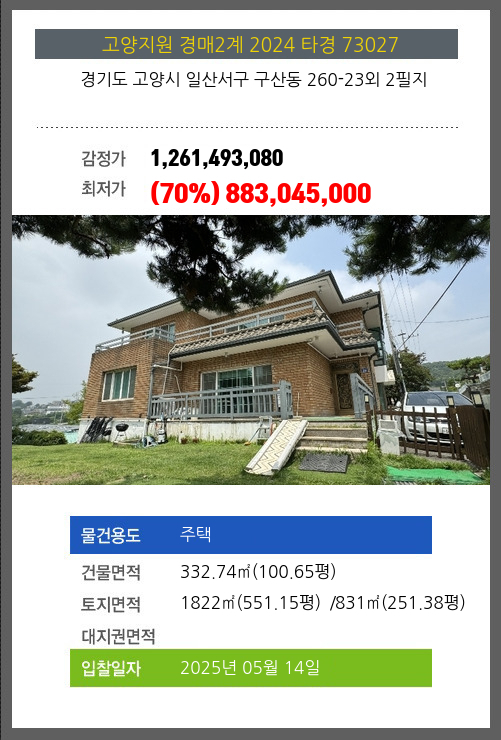 사건번호 2024 타경 73027 본건은 경기도 고양시 일산서구 구산동 260-23외 2필지소재하는 주택경매 물건의 포스팅입니다. 건물면적 [ 332.74㎡ (100.65평) ]토지면적 [ 전체:1822㎡ (551.15평) 매각지분:831㎡ (251.38평) ]