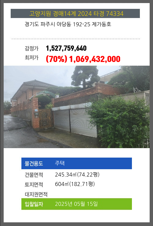 사건번호 2024 타경 74334 본건은 경기도 파주시 야당동 192-25 제가동호소재하는 주택경매 물건의 포스팅입니다. 건물면적 [ 245.34㎡ (74.22평) ]토지면적 [ 604㎡ (182.71평) ] 시세를 반영한 감정가