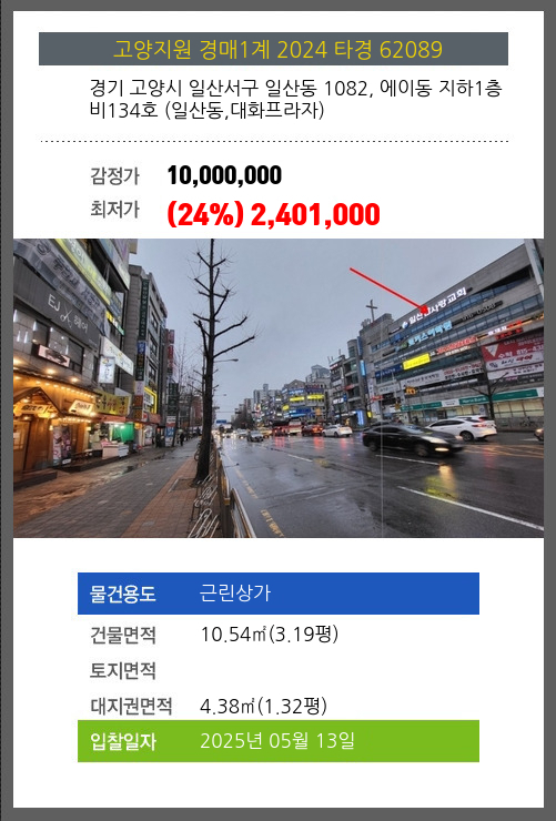 사건번호 2024 타경 62089 본건은 경기 고양시 일산서구 일산동 1082, 에이동 지하1층비134호 (일산동,대화프라자)소재하는 근린상가경매 물건의 포스팅입니다. 건물면적 [ 10.54㎡ (3.19평) ]대지권 [ 4.38㎡ (1.32평) ]