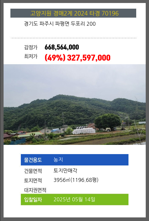 사건번호 2024 타경 70196 본건은 경기도 파주시 파평면 두포리 200소재하는 농지경매 물건의 포스팅입니다. 건물면적 [ 토지만매각 ]토지면적 [ 3956㎡ (1196.68평) ] 시세를 반영한 감정가 668,564,000에서2회