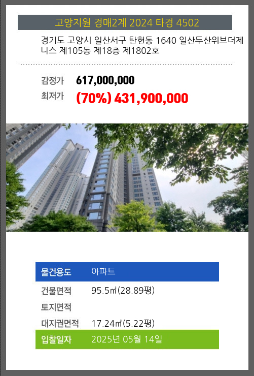 사건번호 2024 타경 4502 본건은 경기도 고양시 일산서구 탄현동 1640 일산두산위브더제니스 제105동 제18층 제1802호소재하는 아파트경매 물건의 포스팅입니다. 건물면적 [ 95.5㎡ (28.89평) ]대지권 [ 17.24㎡ (5.22평)